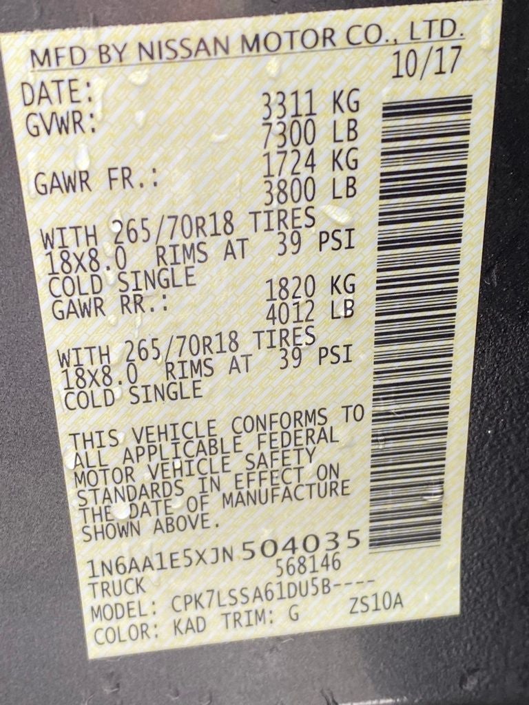4WD, 2.937 Axle Ratio, 4-Pin/7-Pin Wiring Harness Connector (Rear Bumper), 4-Wheel Disc Brakes, 5.5' Drop-In Bed Liner, 6 Speakers, ABS brakes, Air Conditioning, Alloy wheels, AM/FM radio: SiriusXM, Auto-Dimming Rear-View Mirror, Automatic On/Off Headlights, Blind Spot Warning w/Rear Cross Traffic Alert, Brake assist, Bumpers: chrome, Carpeted Floor Mats w/U01, CD player, Chrome Interior Door Locks, Cloth Seat Trim, Convex Spotter Mirror, Driver door bin, Driver vanity mirror, Dual front impact airbags, Dual front side impact airbags, Dual Zone Automatic HVAC, Electronic Stability Control, Electronic Tailgate Lock, Front & Rear Parking Sensors, Front anti-roll bar, Front Center Armrest w/Storage, Front Manual Split Bench Seat (40/20/40), Front reading lights, Front wheel independent suspension, Heated door mirrors, Heated Front Captain's Chairs, Illuminated entry, Intelligent Key System, Leather Seat Trim, Leather-Wrapped Steering Wheel, Low tire pressure warning, Occupant sensing airbag, Outside temperature display, Overhead airbag, Overhead console, Painted Rear Bumper, Panic alarm, Passenger door bin, Passenger vanity mirror, Power door mirrors, Power Sliding Rear Window w/Defogger, Power steering, Power windows, Radio data system, Radio: Nissan Navigation System w/Voice Guidance, Radio: NissanConnect AM/FM w/SiriusXM, Rain Sensing Wipers, Rear Air Conditioning Vents, Rear anti-roll bar, Rear seat center armrest, Rear step bumper, Rear window defroster, Receiver Hitch, Remote keyless entry, Security system, Siri Eyes Free, Speed control, Speed-sensing steering, Speed-Sensitive Wipers, Splash Guards, Split folding rear seat, Steering wheel mounted audio controls, SV Convenience Package, Tachometer, Telescoping steering wheel, Tilt steering wheel, Traction control, Trip computer, Turn signal indicator mirrors, Universal Garage Door Opener, Variably intermittent wipers, Voltmeter, Wheels: 18 x 8 Silver Painted Alloy, 4WD.